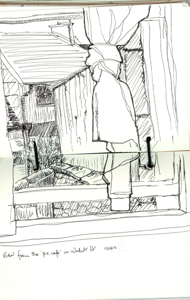 We had a lot of kindness shown to us in Bath; we received sponsorship from the local wine merchants and the furniture hire firm and because the gallery, an old mortuary chapel, doesn’t have a toilet, the staff at the ‘Made By Ben‘ pie cafe down the road let us use their facilities. Most welcome. And their home made pies are gorgeous too. Husb and I had a few hours doing the tourist bit on Friday and stopped off at the pie cafe for a spot of brunch. I did this drawing from the window at the back of the snug little tearoom into my A6 recycled, leather-bound sketchbook.
