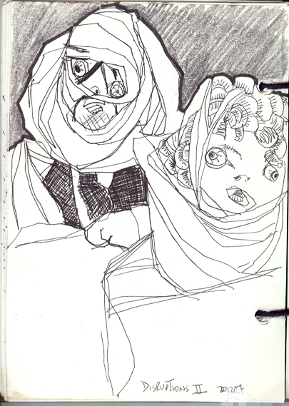 I wandered up and down the street drawing the happening in an appropriate costume. Here I am. It was hot and smelled of rubber.