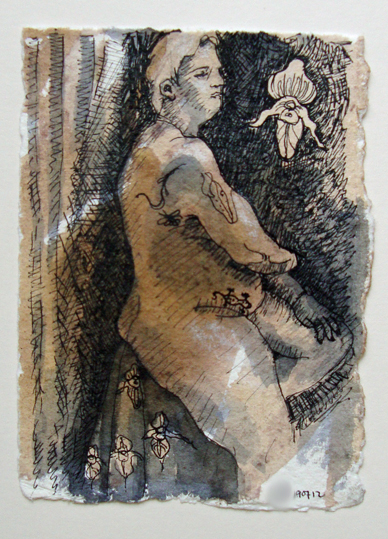 This is one of our wonderful models from Swansea’s life drawing group. She’s a retired teached who has the most marvellous tattoos over her body; ants and flies running around being chased by lizards; pitcher plants and orchids trailing over her back and shoulders. I’ve used some of her tattoos as motifs in other parts of the drawing. She has a whole new career since she retired, inspiring artists.