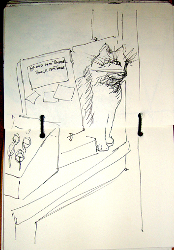 I wandered into Swansea Museum yesterday and met a gorgeous, large ginger-and-white moggy. She’s a frequent visitor; she lives in the local pub on the corner and trots up to the museum most days and her name is Megan. She sat on the receptionist’s counter for a few minutes, just enough to let me do the briefest sketch and then trotted off after a group of small schoolchildren, who squealed with delight as she followed them.