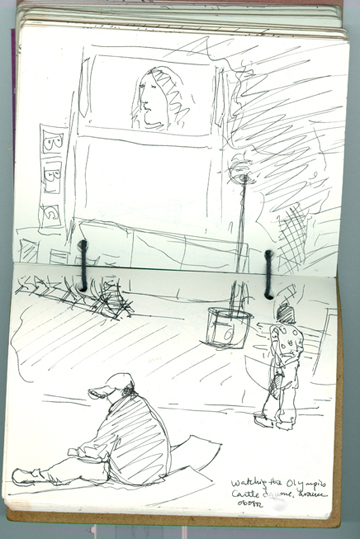 Today we had a drive around West Wales, going to a new exhibition at Waunifor and exploring the fleshpots of Llandysul. Only there are no fleshpots in Llandusyl :). So I wasn’t inspired to do any drawing. That’s an excuse; I just wanted a break. So here’s one I did last week, when the Olympics was still on. There was a giant screen and deckchairs in Castle Square in the city centre and we stopped there occasionally for a rest and to catch up with the Olympic news. I’m not normally into sport, except for Rugby Internationals, but there was something special about this Olympic Games, Danny Boyle’s amazing opening event and all those sweet sportspeople – Jessica Ennis, Mo Farrah and Usain Bolt – terrific. I wasn’t expecting even to watch it let alone enjoy so much.
