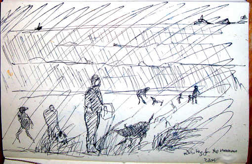 The race was won, as usual, by Kenyan runners. I wonder what they make of it, coming from a very hot country at high altitude to run in one of the wettest countries on the planet, just a few yards from the sea. Husb managed to shave 6 minutes off last year’s time, despite the awful weather. I scribbled the dog-walkers on the beach which runs alongside the race route. It gives some idea of the bleak, windswept conditions. Maybe next year I’ll manage the 5k? 😀