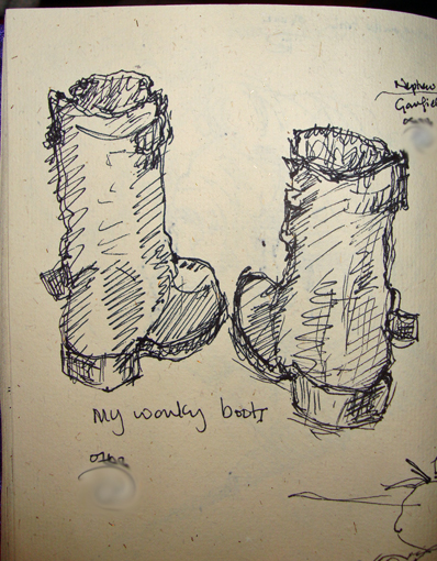 Only time for a very quickie sketch today so I scribbled my boots which are a bit wonky now that I’ve worn them in. I’m not a shoe person and I don’t like shiny, pristine footwear so I like my boots best when they’re a bit battered. I don’t get the shopping for shoes thing at all. However, I have far more pairs of boots than I let on to Husb 😉