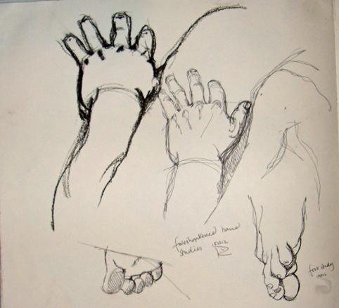 It’s a season of new models at our life drawing group; a new female model last week and a new male this week. I had fun with the pastels then did some smaller studies of his hands and feet. It was a one hour pose with some serious foreshortening – I’m a glutton for punishment.