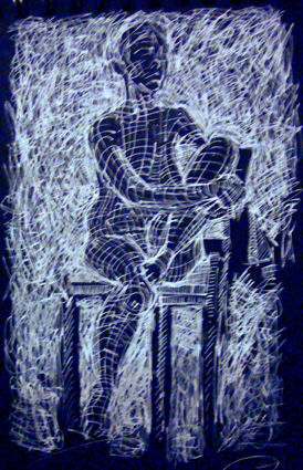 Sometimes I draw in white ink into a rather lovely black sketchbook by Paperchase. But it ain’t half difficult! Funny thing is, if I draw onto paper that I’ve coloured with a wash, I really enjoy it. Maybe it’s because the commercial one is so evenly coated and perfect, it’s like drawing straight onto a perfect sheet of fine white paper – inhibiting. When I draw nudes onto black, I like mapping a grid over the surface of the body. It’s gives a three dimensional look and it also looks a bit science fictiony. I think I’ll have to be more assertive with the sketchbook and not let it intimidate me – maybe attack it with white oil bars or white conte instead of using a fine line pen. That’s it – I’ll get all butch!