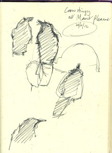 Just a quickie as I was walking past a lampost this morning and I saw this crow thingy on top. He wanted to fly down and eat some discarded food on the road but I was too close. He made his views known by making squawking noises at me and moving his body and head up and down. I’m no twitcher so I don’t know what sort of crow thingy it was. Just managed a few scribbles before he flew off in disgust.