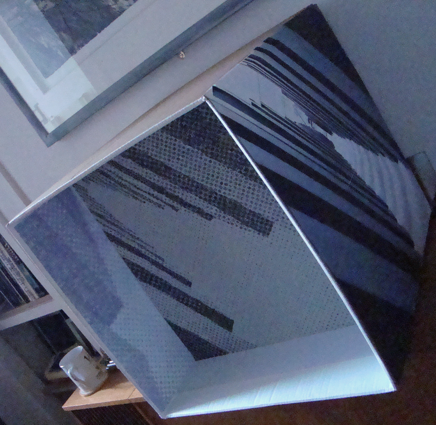 I did a drawing in Faber Castell Pitt pens (various sizes in black) onto Mark Resist (Mylar) film, 20 inches square and mounted it about one-third inside the box. I printed out a lightened version of the first drawing I did of this topic, a couple of years back, and stuck segments of it to the interior walls, leading the eye into the main drawing. Finally I printed out the original digital photograph and stuck it onto the side of the box. Oh and Husb mounted an LCD light inside so it can be seen at night. Very different from my usual work.
