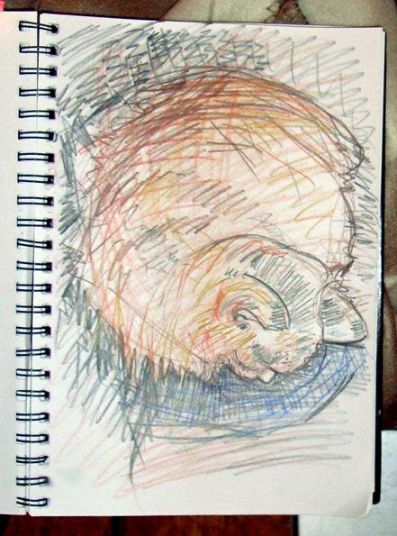 Still wrapped up in a blankie indoors getting more and more fed up, which probably means I’m on the mend. I’m fed up drawing the cats and fed up with my drawing pens so I had a scribble with Ming The Merciless into a larger A3 sketchbook and used some Derwent Academy watercolour pencils for the scribbling action. Now I’m not a big fan of pencils, or watercolours, but it’s a good exercise to break out of your comfort zone occasionally.