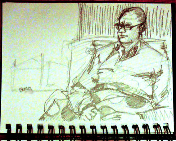 As I get over the lurgi, poor Husb goes down with it! He’s been looking after me for the past month and it’s my turn now. He needs comfort food so some home-made chicken and vegetable soup followed by a banana cake with Snickers cream. That’s two Snicker bars, melted with a pot of double cream, cooled and whipped and used to sandwich and top the cake. Then I grated another Snickers bar over the top. Here he is, poor dab, wrapped up in a blankie on the settee. Reeves pencil (F) into an A6 spiral bound hardback Winsor and Newton sketchbook.