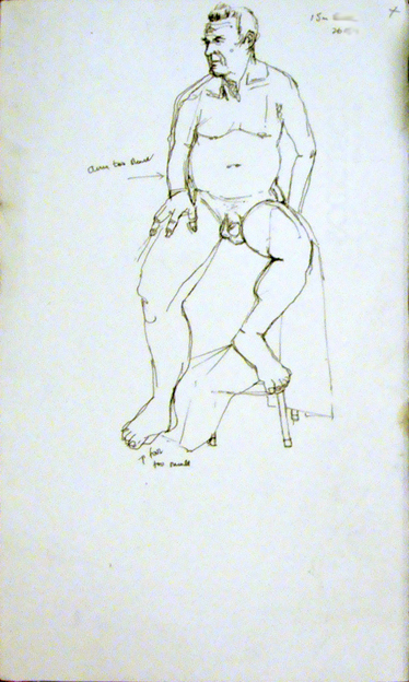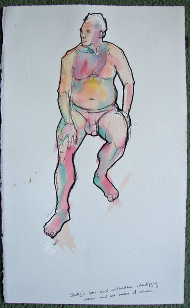 I like to draw older models because it’s interesting to see how anatomy changes with age. When I’m drawing, I often make mistakes and do a few sketches until I get it reasonably right. Here’s the first attempt (above) with notes about what’s wrong with it. I had another go and was happy with the second drawing, done in Faber Castell Pitt drawing pens, various sizes, onto Somerset 250gsm paper. I added colour with Winsor & Newton half pan artist water colours.