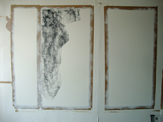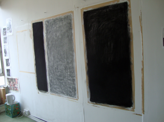 I started by stretching large pieces of Fabriano 240gsm paper onto a wall, soaking them lightly. When they were dry I gave them 2 coats of acrylic gesso, leaving them to dry between coats.