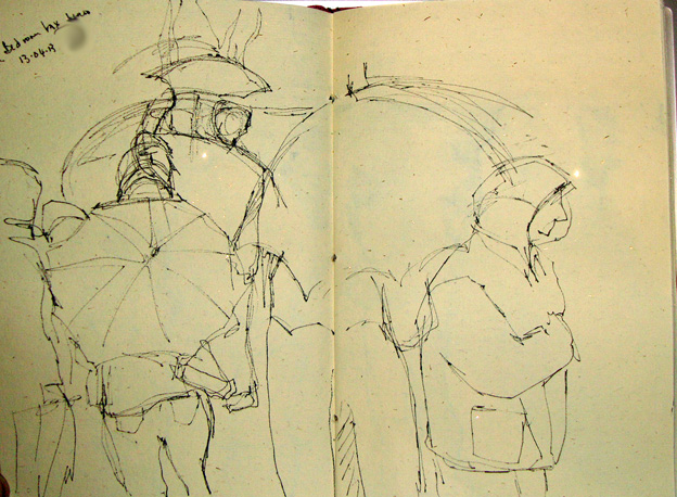 I drew these into my A5 pink silk recycled sari sketchbook, with a Pentel V5 pen, later augmented with Faber Castell Pitt drawing pens, sizes S, M and B. It was raining and the damp paper was difficult to draw on. It’s good practice to draw crowds; to get the measurements and proportions to look right. I might try redrawing from these to see if I can put a composite picture together.