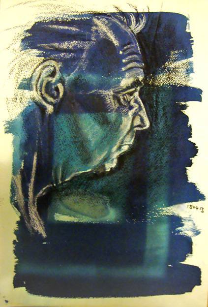 At the print workshop we work with some beautiful papers and always use the best quality for the courses we run. It’s surprising how many people never collect their work afterwards. Even if they don’t like the image, there’s a lovely – and expensive – piece of paper that can be used again. I’m always trawling the paper recycling bin for anything that can be re-used. I found some pieces of Bockingford 250gsm that had been prepared for cyanotype but then thrown away without exposing an image onto them, leaving a gorgeous expanse of blue. I went to life drawing group this evening and after a dodgy start, settled into drawing a portrait of our model in black and white conte crayon, which worked very well with the heavy texture of Bockingford.