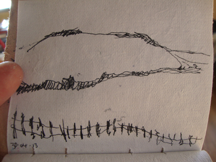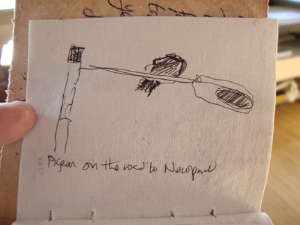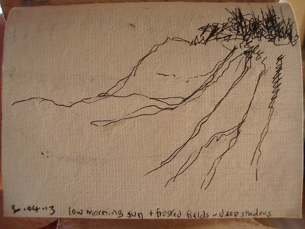Maybe. I’m using a Mac and I hate it! I’ll never slag off Bill Gates again! Here are the first drawings I did on my journey (I hope). There’s one of pigeons hanging out on a rooftop in Chepstow and the others are very quick sketches that I made as the bus to Heathrow was traveling through Wales early in the morning. The low sun threw vast shadows across the frosted fields.