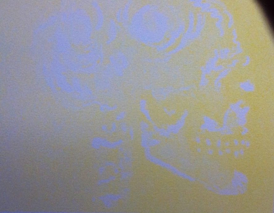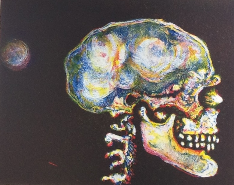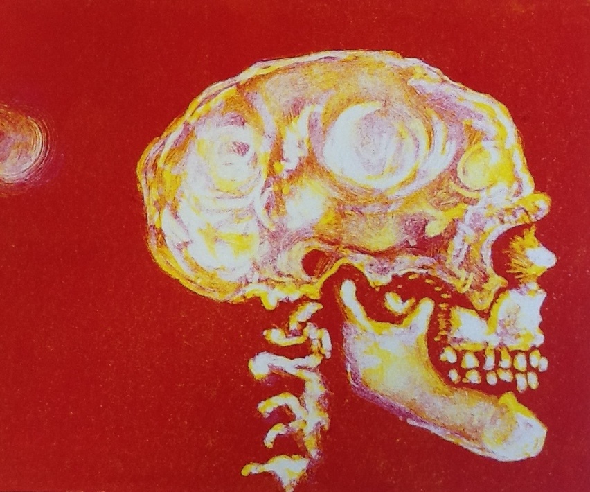 Back in my wilder, younger, biker days I was very fond of a local beer, Brain’s S.A., fondly nicknamed Skull Attack. Now I’m older and wiser (?!) I like to use skulls in the development of my artwork. I’ve been at Wingtip Press in Boise, Idaho, collaborating with a group of artists to develop a body of full-color monotypes and I’ve been using my drawings of skulls as my subject.