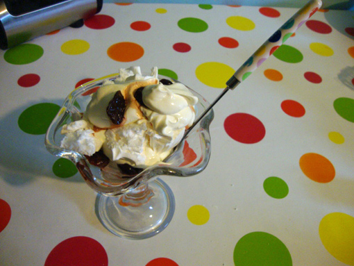Teatime. Swansea Eton Mess with morello cherries in kirsh, meringue and whipped cream. Nom. Nom. Nom.