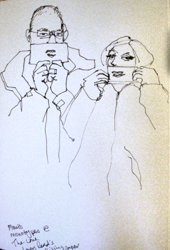 Kissing Paper by Lucy Read is a day and night of drawing shenanigans at The Cove in Swansea. Husb and I went earlier today and got stuck in. We painted our lips with a black goo (I think it was graphite and something….) and kissed in sequence…a piece of sellotape, a piece of tissue and a piece of white paper. Lucy hung the MWAH monotypes from a line in the gallery and then we did some drawing with graphite and chalk lips that she’d made from melted down crayons and powdered graphite and chalk. I had my brand new sketchbook to break in – it’s a Laura Ashley cloth-bound notebook, size A5, so I quickly scribbled Husb and pal Elena holding their MWAH monotypes.