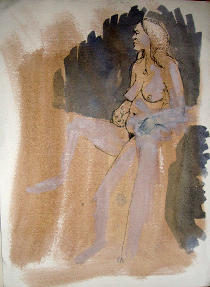 Just got back from this evening’s life drawing session at Swansea Print Workshop, which was a bit of a curate’s egg….good in parts. I loosened up with my first drawing, using white conte crayon and a lump of carbon onto a piece of handmade paper that I’d prepared with a dark ink wash. I like this, it’s much freer than my normal approach. Then I retreated into my comfort zone, with a dip pen and Indian ink.