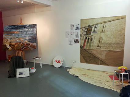 It’s been a long day, doing art. First off, I was with my colleagues from the art collective, 15 Hundred Lives, at the Creative Bubble artspace in Swansea, doing what artists do all day, making art. People usually see art in its finished state, framed and hung on a wall in an intimidatingly white gallery. We want to make art much more accessible to the public and also let people see just how complicated and long the creative process is. I spent the day constructing a large drawing in chalk and charcoal, with a touch of chalky pastels, onto brown parcel paper. Tomorrow I’ll be adding a second layer to the drawing and extending it across the wall with a translucent paper overlay. My colleagues worked on a large painting and a wall-sized collage.