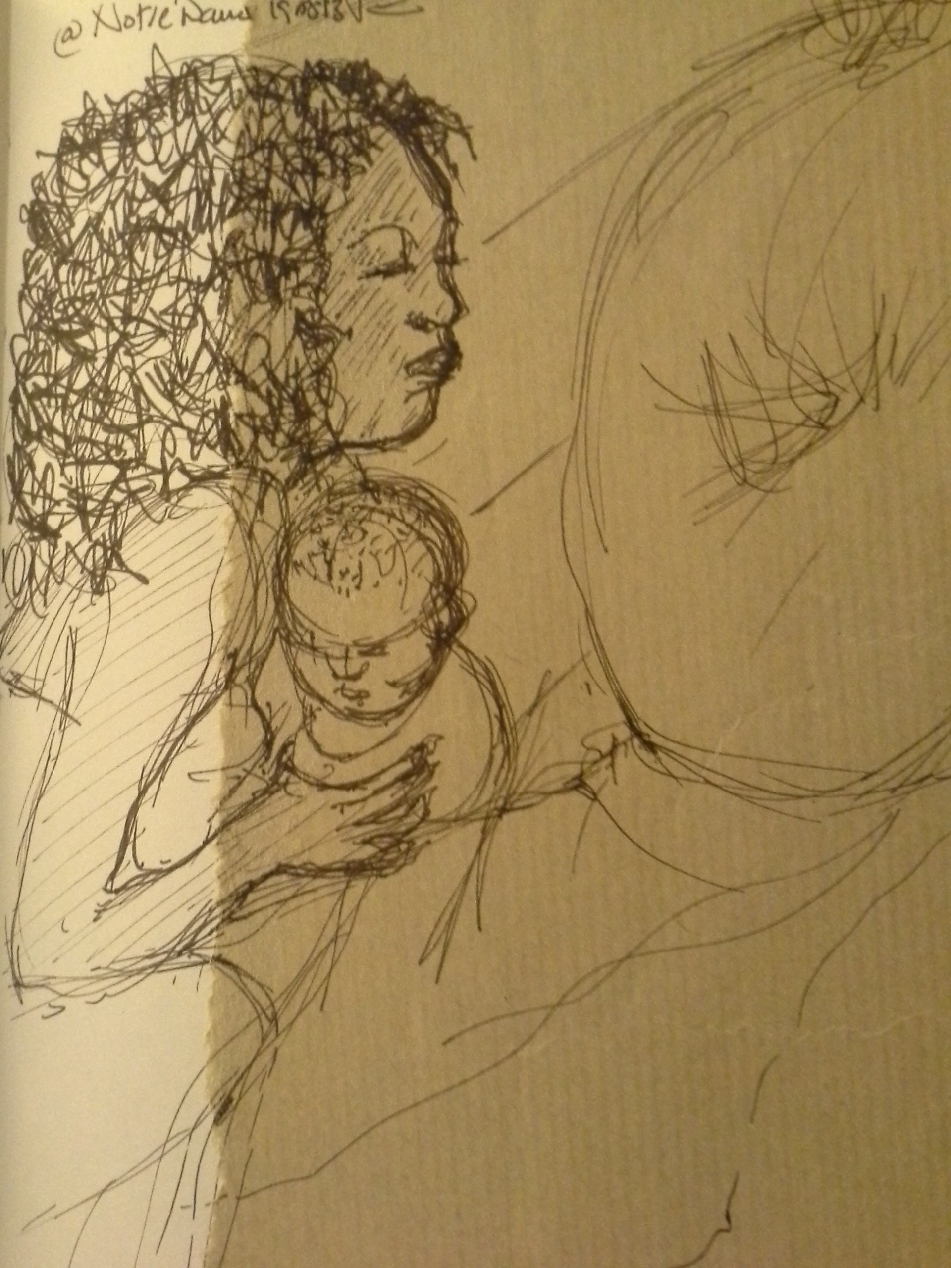 Yep. I’m on my travels again, courtesy of Eurostar and a budget hotel, Husb and I are in Paris for a couple of days. Arrived this morning and already shattered, we crammed in Notre Dame, Saint Chapel level, a sculpture park and some heavy duty walking. It’s very hot. Here’s a young mother and her baby outside Notre Dame.