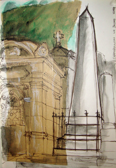 1. That’s a great drawing, the background brown paper works so well. I always wanted to visit Jim Morrisons grave at Pere Lachaise, but apparently it has been badly abused by so-called fans. But I do love those huge French necropolises.