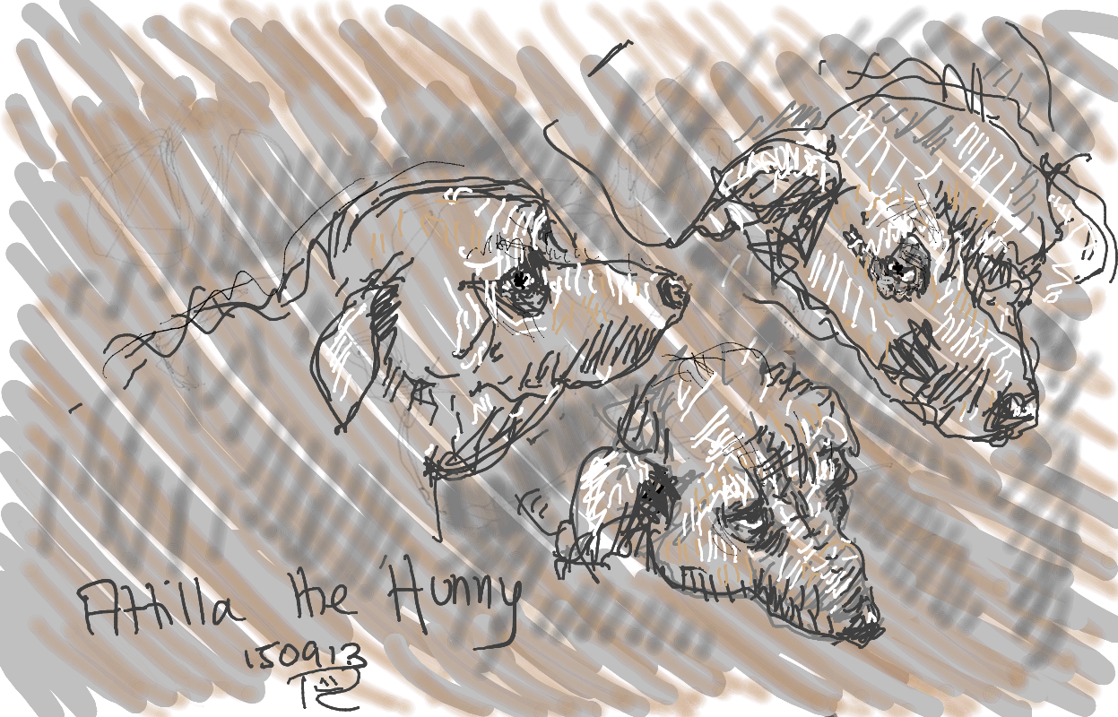 Went to visit relatives today and did a scribble of the family dog, Attilla the Hunny. She’s very large and boisterous, which is where the Attilla bit comes from and Hunny because she’s a real sweetie. She did not like being drawn because I had to stare hard at her. My kitties LOVE posing while I draw them, the more I stare at them, the more they love being the centre of attention. But poor Hunny was very uncomfortable with it and kept fidgeting.