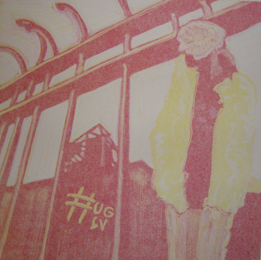 Did a really long session at Swansea Print Workshop as there’s nothing like a deadline to make you work like the clappers. I’m working on two full-colour monotypes at the moment. Each print has three separate layers overlaid. The first is Process Yellow, then Process Red and finally Process Blue. Today I managed to do the yellow and red layers. Back tomorrow to do the final one.