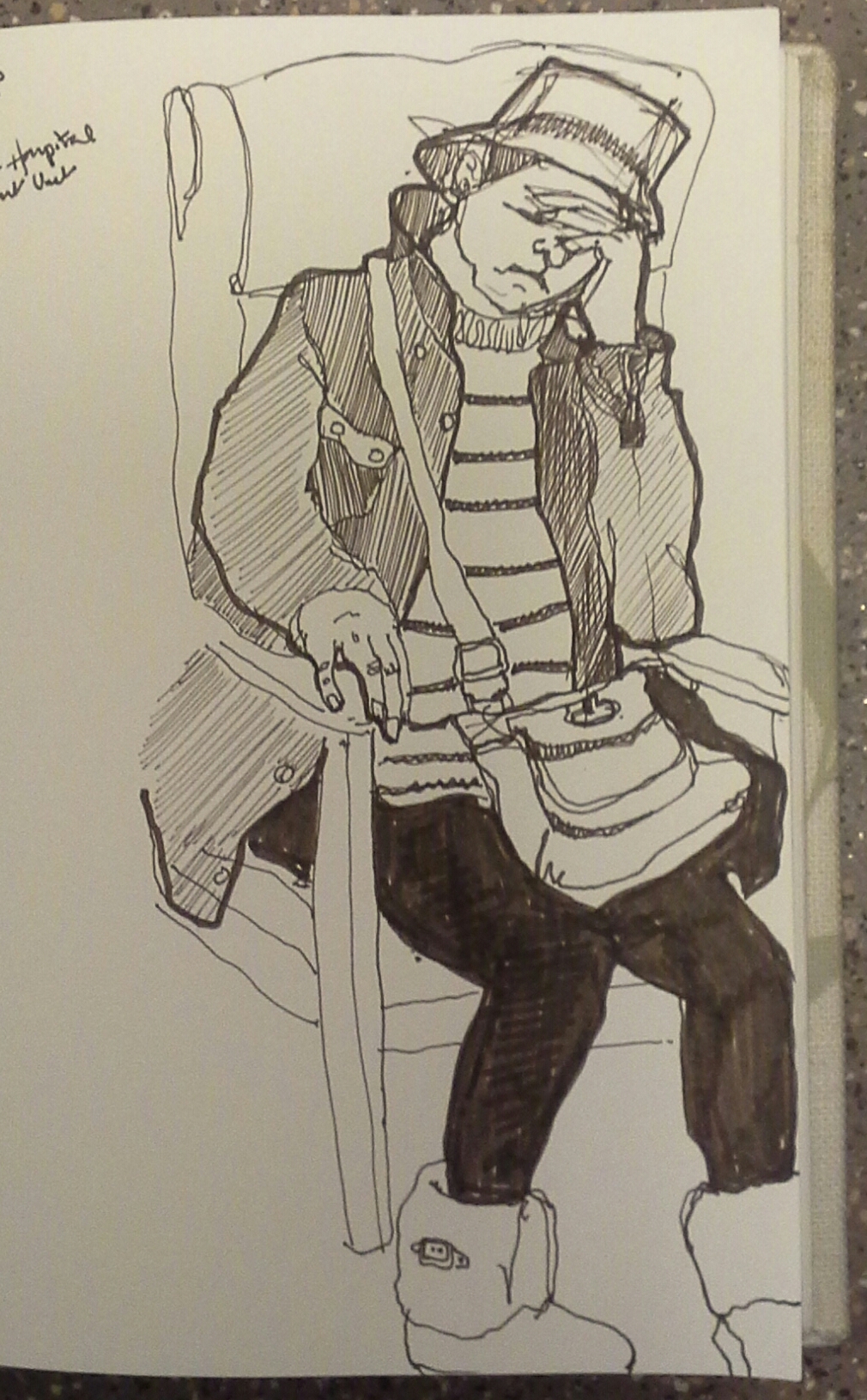 I did this drawing recently when I accompanied a relative to hospital. They’re not the most cheery of places but they’re very interesting for an artist, with a massive cross section of people who are usually too absorbed in other things to notice the scribbler in the corner.