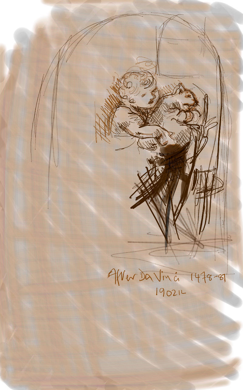 Another of my practice pieces copying Renaissance drawings. This time a little sketch by da Vinci of a small child playing with a cat. The original is very rough and sketchy, very lively. I guess it had to be that way because a cat and small child are not going to stay still for more than a couple of seconds. In fact, the kitteh looks like it can’t wait to get away. He did quite a lot of these sketches; I wonder if the child escaped without scratches? It’s tempting when copying another artist to tidy up the drawing, to ‘complete’ it but I tried to remain as true to the original as possible, given that I’m using 21st century instead of 15th century materials.