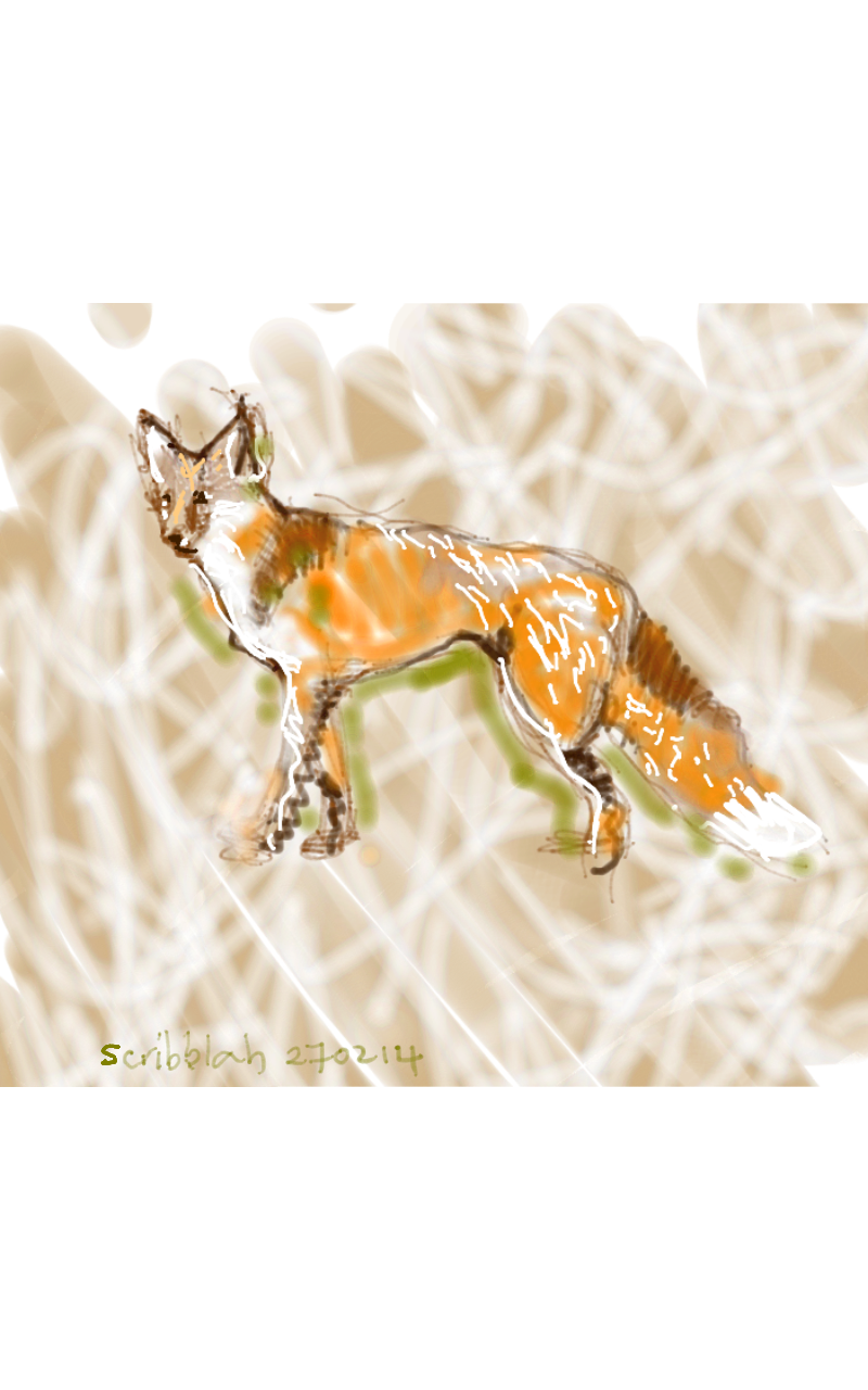 So I’ve just had a nice cup of chamomile tea to calm me down, a toasted teacake to cheer me up (with Welsh farm salted butter, of course) and I sketched a fox. Quickly. And now goodnight 🙂