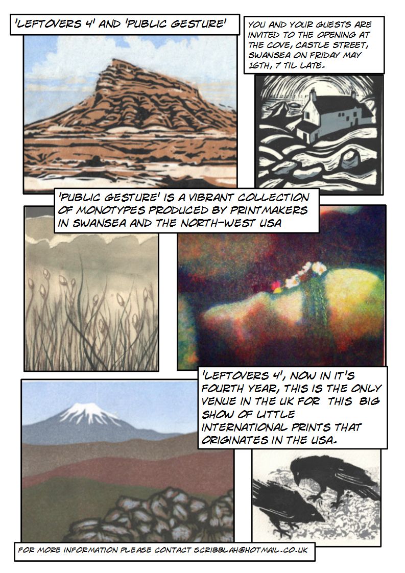 Please come along to the opening of these two international printmaking shows in one! And a great venue too. Now in it’s fourth year, ‘Leftovers 4’, organised annually by Wingtip Press, Idaho has travelled all over the world and this is the only UK venue for this big show of little international prints. ‘Public Gesture‘ is a collection of monotypes created during a collaboration between printmakers from the North West USA and Swansea Print Workshop. Over 150 artists are represented including Hannah Frederika Lawson, Patricia Mckenna Jones, Lynne Bebb, Kara Seaman, Gayle Rogers, Chris Williams, Chris Harrendence, Sally Price, Cassandra Schiffler, Mary Donato, Tyler Hackett, Karl LeClair, Gale Everett Stahlke and Lisa Flowers Ross. Oh and me 😀
