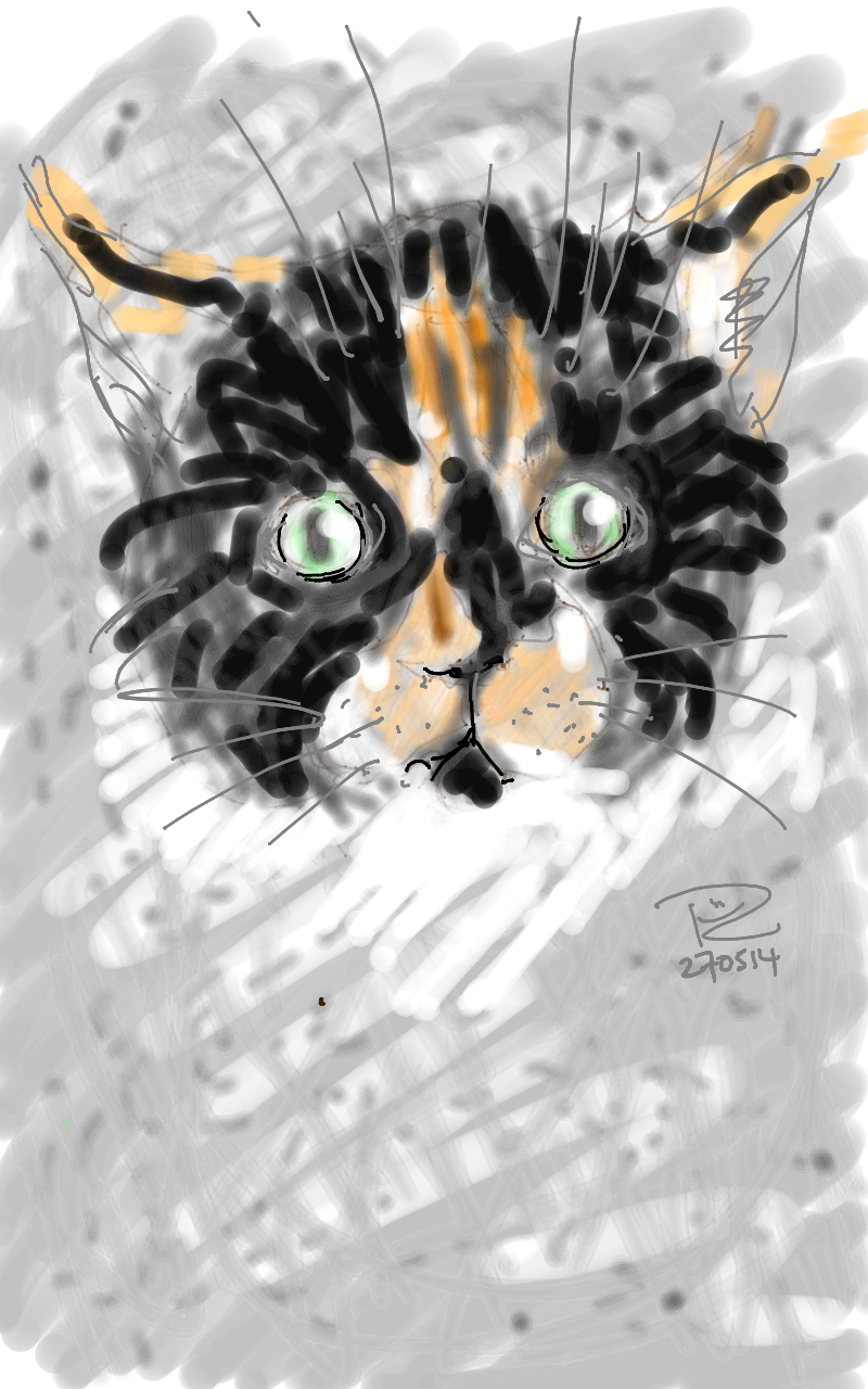 Heard a lot of noise on the roof around 6pm. Sparta Puss was facing off a very large and angry seagull. Husb and I tried to persuade the cat to come down but she was having none of it, so we left them to it. A few minutes later she came storming into the house and gave me a slap! Then she settled down on the stool in front of me in a right strop! What a temper. She glared at me for ages. So I scribbled her. She’s turned her back on me now. What did I do?????