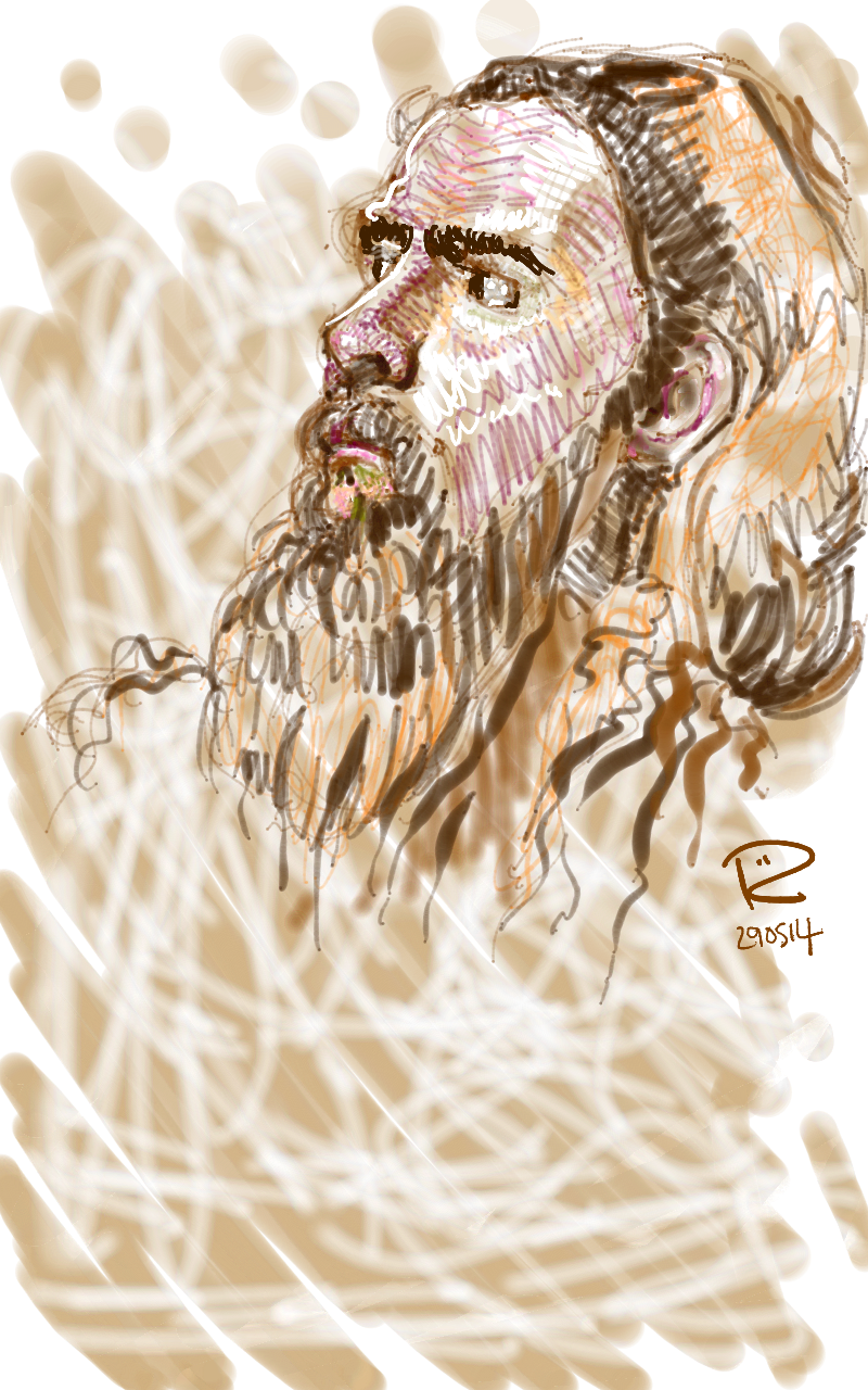It’s nice to have a very hairy person to draw and I got very Renaissance in my approach. I drew onto my Samsung Galaxy Tablet Note 8 using the free Markers app. I’m getting used to the function that is responsive to pressure.
