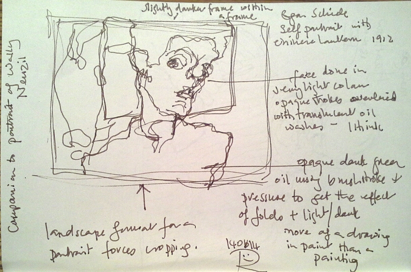 I stopped for some time in front of this self portrait by Egon Shiele at The Leopold Museum in Vienna. I have seen it many times in books but was fascinated when I came face to face with it. The brushwork is so fluid and he creates light and dark and the flow of the material on the clothes by simply using brushstrokes. I made a lot of notes around the quick sketch.