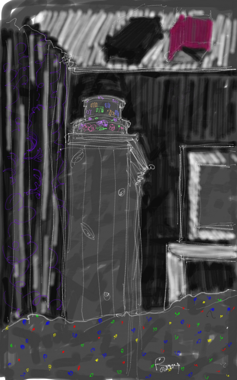 I went to bed a bit earlier to try and catch up with sleep after all the insomnia I’ve had recently, then remembered that I hadn’t done a drawing. So I scribbled the corner of my darkened bedroom on my Samsung Galaxy Tablet Note 8 using the free Markers app.