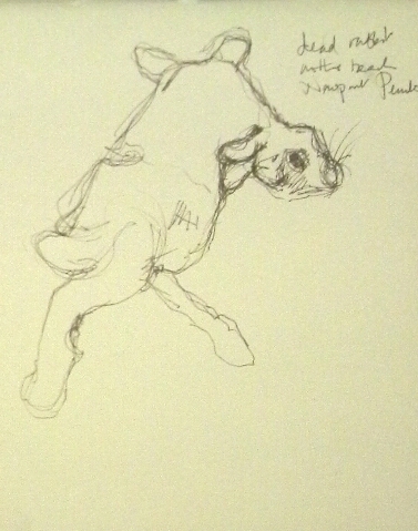 Husb and I visited friends in north Pembrokeshire this afternoon and went for a long walk along the estuary and beach at Newport. I was surprised to find this broken corpse of a wild rabbit on the sand. It was a sad sight and I looked away at first but then decided to sketch it. The body wasn’t marked or torn in any way, although its eye sockets had been picked clean. We wondered how it had got there. A fox or dog maybe? But it hadn’t been gnawed or worried. Dropped by a bird of prey? It wasn’t a baby rabbit, but not fully grown either, so that’s a possibility. We’ll never know.