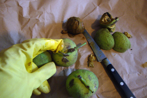 It’s Autumn, it’s walnut season and my chum, artist Melanie Ezra, has discovered some walnut trees near her home. She gave me some she picked. I read somewhere that walnut skins make very good ink, so I’ve started to prepare them. I have an allergy to walnuts, they interfere with my breathing, so I wore rubber gloves, which is a good idea anyway because a dark brown liquid oozes out as soon as the skin is pierced and it stains.