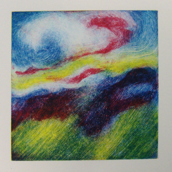 I’m working on a series of full colour reduction monotypes at the moment and I spent all day at Swansea Print Workshop, on my feet! I’m exhausted. People don’t realise how tiring art can be. The series is based on small pastel drawings I did when I was in Pakistan earlier this year.  This technique uses a perspex plate to make three drawings into ink; the first in Process Yellow, the second in Process Magenta and the third in Process Cyan. They are printed in this order to give a full colour image. The plates are put through the press a second time to give a ‘ghost’ monotype.