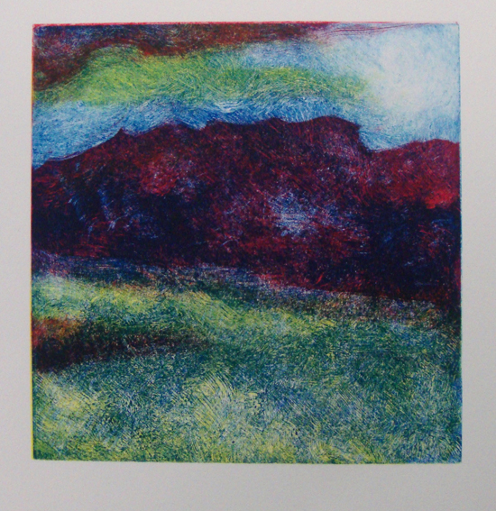 I had a marathon monotype session at Swansea Print Workshop yesterday and produced 4 full colour monotypes and 4 ‘ghost’ monotypes which is a record for me. I was corpsed at the end of it though. I drew the yellow and red plates in broad strokes with cotton rags and scrim (tarlatan). On the final, blue, plate I worked with tiny strokes and stabs with the scrim, covering the surface of the ink with tiny, tiny marks. When this was printed over the other two colours, it gave a soft twilight effect.