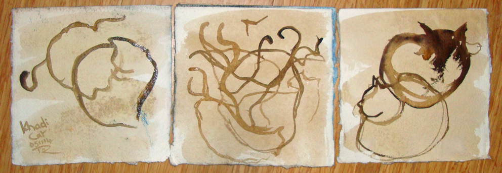 It’s Bonfire Night and the sound of exploding fireworks is unsettling Sparta Puss, who is alternating between dozing fitfully on my stool and pacing around the living room. I have a few small Khadi sketchbooks, beautiful textured handmade paper from India and some sepia walnut ink I made recently, so I grabbed a brush and started sketching her in transit. I’d previously coloured the paper with wet tea bags to break up the white with a pale brown wash, speckled by the rough texture of the paper.