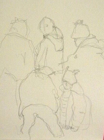 At first, only conifers would grow there, but now most of Kilvey Hill is mixed forest. A couple of areas had become overgrown with thickets of conifers and volunteers were needed to clear them. They’re Xmas trees so we were able to choose one for free in return for our labour. Result! I managed a few action scribbles in between the sawing and showers of hail, using graphite into my A5 Tate Gallery sketchbook.