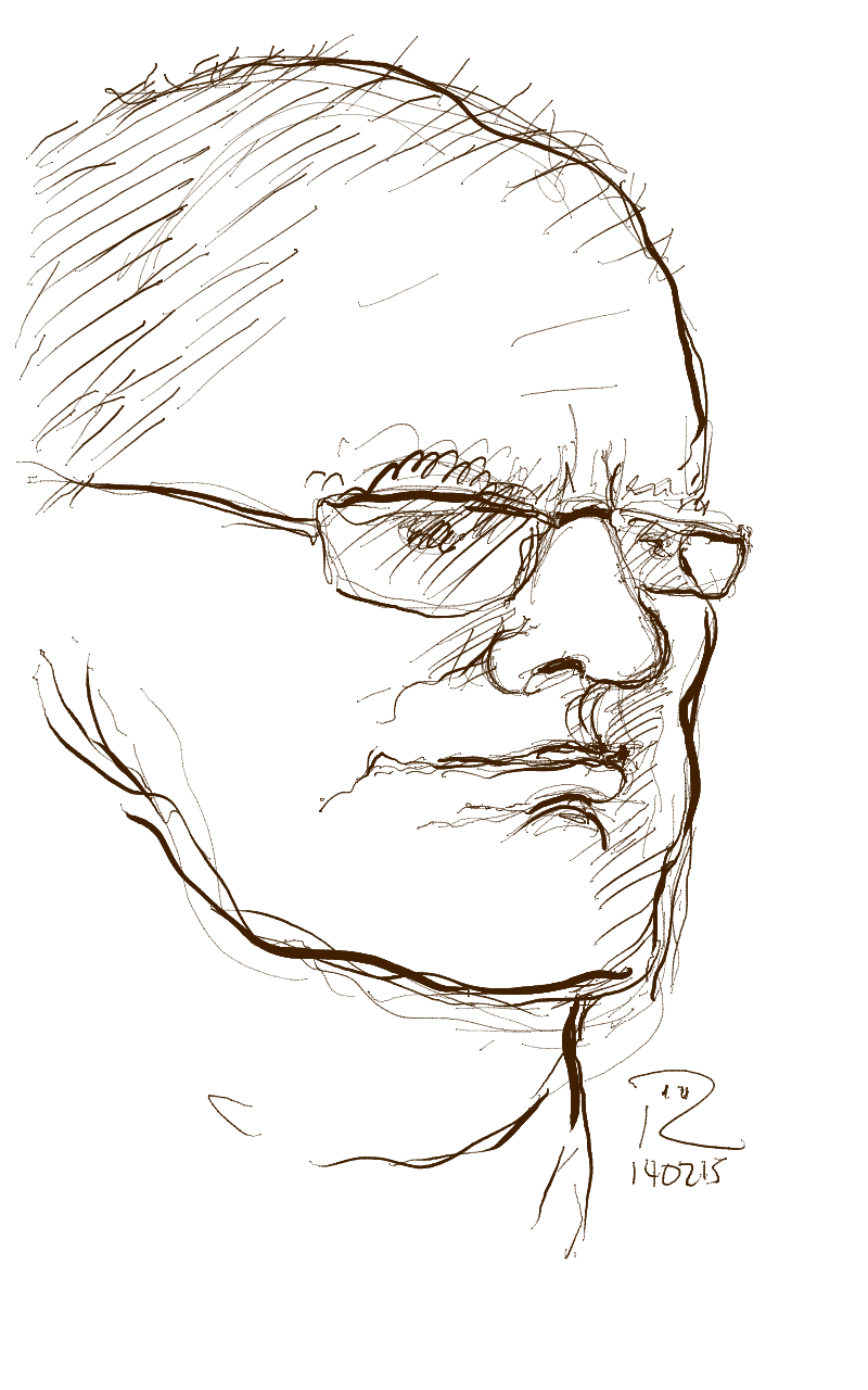 What a day. Terrific opening of the new printmaking show at Galerie Simpson earlier. Now I’m shattered and slumped in front of the telly. There isn’t a cat available for sketching, they’re refusing to hang out with the trained monkeys because they’re on the roof bothering magpies, so it’s Husb again. And now, The Voice. Totally lovely mindless telly 😀