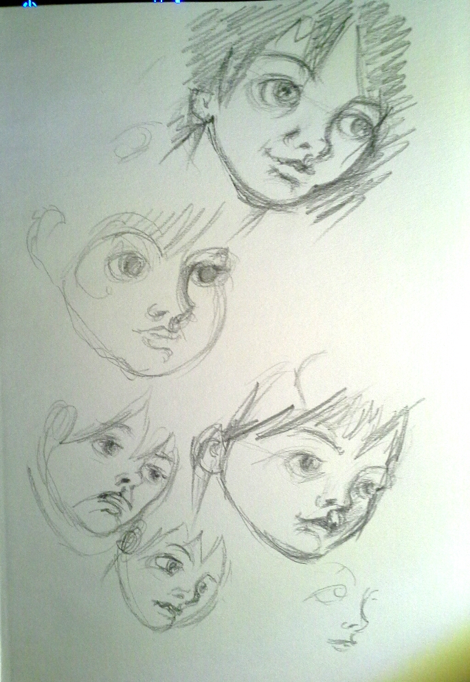 We have some little relatives staying for a sleepover and of course, they are scribbling fodder. My little niece was cwtched on the settee watching a film and I tried to draw her. So very hard! All children are aliens! They have such weird proportions – HUGE eyes, little turned up nose, tiny chin and chubby cheeks. She looks like a Manga cartoon! Every time I tried she ended up looking like a character in a comic book! None of these actually look like her, I’m still struggling so hard to get the proportions right. I’ll get there. I’ll keep on trying. I’ll crack it eventually. Scribbled into my new A5 hardbacked sketchbook with a graphite stick.