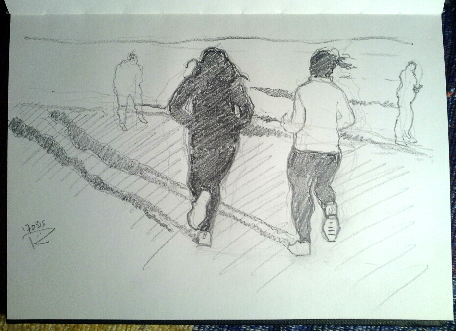 Still on my self-imposed exile from the digital drawing machine, I carried on drawing from some photos I took on Swansea Beach recently. Although speed sketching is very useful, focussing the attention only on what’s absolutely vital, I want to do some more detailed action drawings and these can’t be done with a model or in a fleeting moment.  Drawing from photos helps with composition, foreshortening and scale. I love the long, skinny shadows from the runners caused by a very low wintry afternoon sun. I used two grades of graphite sticks, grey and black, into my A5 hardbacked  sketchbook.