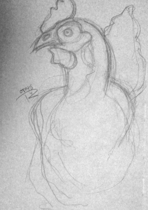 Husb and I visited a friend at her farm today and cut some bamboo canes for our allotment. It was gorgeous, sunny and warm; thirsty work. I grabbed the chance to get some sneaky digital shots of the fidgety chickens and had a bit of a scribble into my A5 hardbacked sketchbook with a grey graphite stick. I’ve had a bit of practice recently with our parrot visitor, Richard the Bird, so I was more familiar with the chicken – the round eye set in a faintly dinosaur-like head. I think it’s a hen but I’m not really sure how to tell.