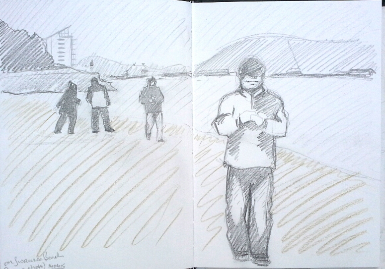 I did this sketch from a digital photo I took a couple of weeks ago on Swansea Beach. The weather has changed radically since then, today’s walk was in brilliant sunshine, not like the wind and drizzle these poor tourists were putting up with.