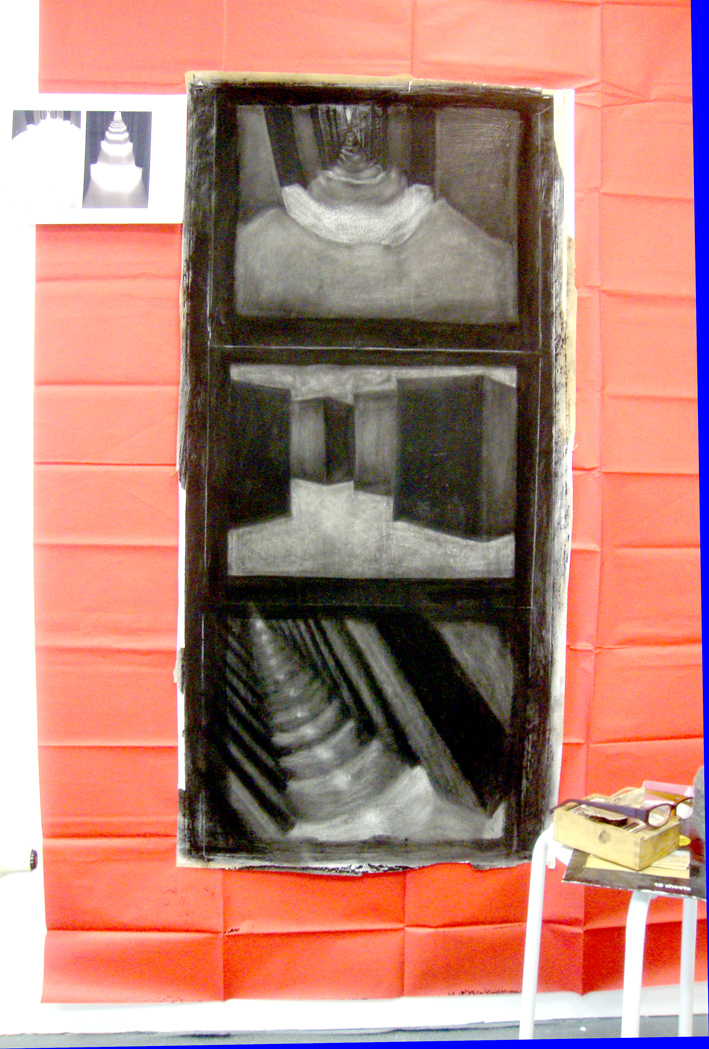 These are three separate drawings; I’m working on one piece of paper because it’s easier to prepare one larger rather then lots of smaller pieces. Eventually I’ll separate them and frame them up, probably in very plain boxy frames, for an exhibition coming later this year.