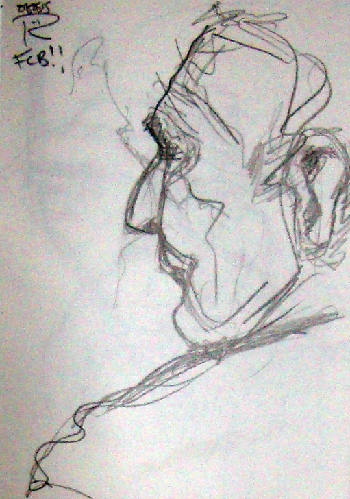 Husb and I went to our local Greasy Spoon caff earlier to meet up with some friends for a consolatory F.C.B. to cheer ourselves up after the UK election results. We stuffed ourselves and I took the opportunity to scribble some of the other punters. One of them was a little old lady who was wearing a typical little old ladies woolly hat. At least, it’s typical for these parts. We don’t have the best weather in the world, y’know. Anyway, we consoled ourselves with our grub and have spent the rest of the day in each other’s company, valuing one of the things that matters most in life, friendship.