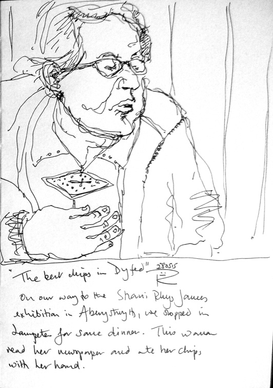 Husb and I took off in the car and headed into West Wales today, through the fleshpots of Lampeter and the mean streets of Aberaeron, all the way to Aberystwyth to see the Shani Rhys James retrospective at the National Library of Wales. It’s a fair old journey so we stopped for a bit of dinner at Lloyds in Lampeter, who advertise “the best chips in Dyfed”. They were well tidy and they were served with the best mushy peas I have ever tasted and two very tasty faggots with onion gravy. I had a quick scribble of the elderly lady on the next table who ate her chips with one hand and held her newspaper in the other.