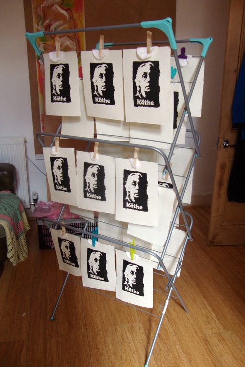 I printed up and the two silkscreens I have been working on for the last week or so. I’m doing some editions from drawings I made of some of my favourite artists starting with Suzanne Valadon and Käthe Kollwitz. They’re small enough to print at home, if they were large I’d have booked the vacuum press at Swansea Print Workshop. I improvised a drying rack with my clothes horse. It worked perfectly well. I’m making a series of these to take to the London Art Car Boot Fair in a couple of weeks, I’m aiming to do eight artists. I’ve never taken my work to anything like this before so I don’t know what to expect. Exciting though.